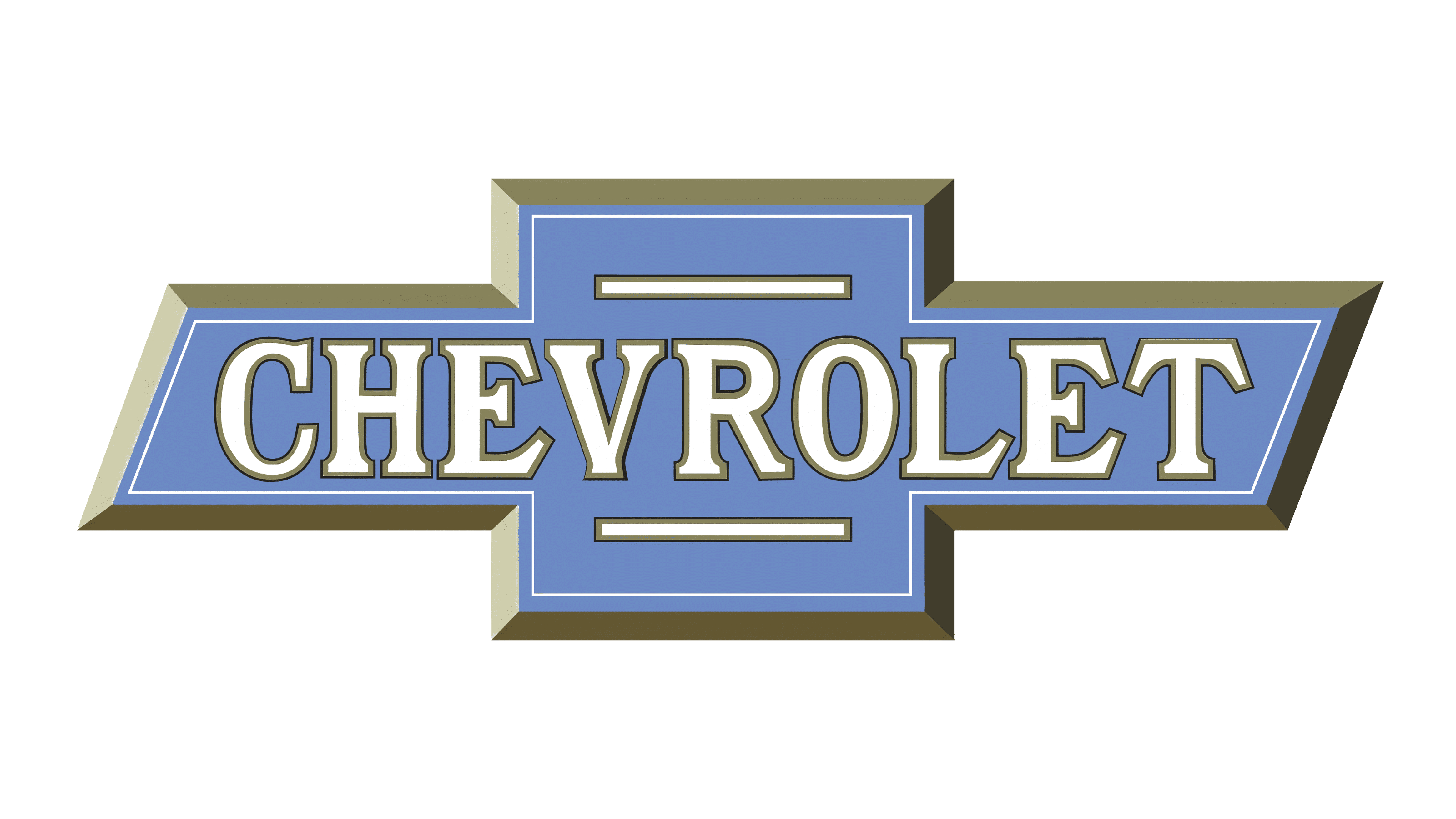 The iconic bowtie logo was also used in the 1940s by Chevrolet, bringing back the delightful blue and gold color palette from the badge of 1914. It was a flat, two-dimensional badge in a thick golden frame, with the bold white sans-serif lettering written over the intense blue background of the cross, and accompanied by two thin white horizontal lines.