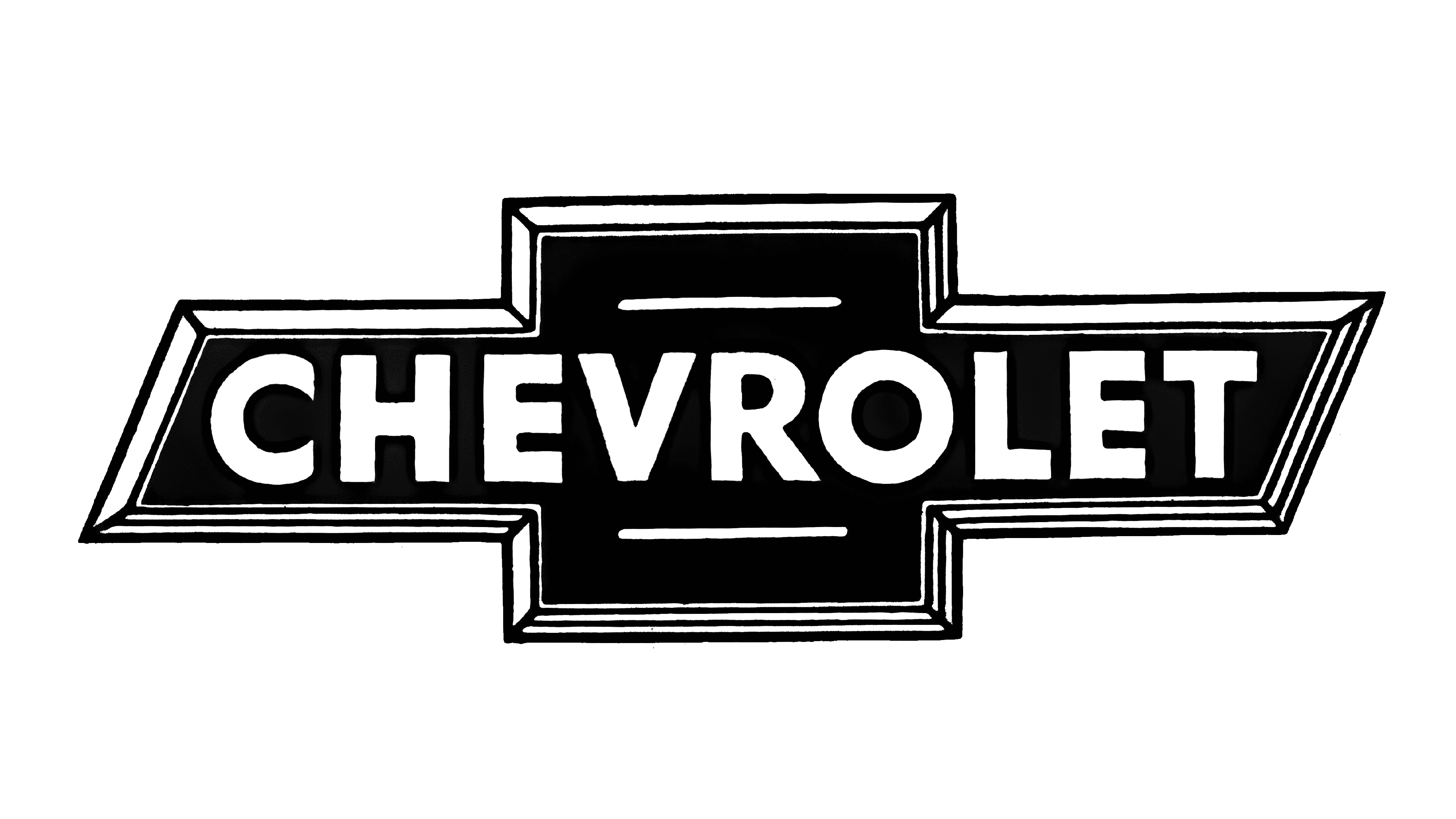The redesign of 1934 kept the shape and composition of the Chevrolet logo untouched but switched its color palette to flat black and white, and rewritten the logotype in a bold and modern sans-serif typeface. The white horizontal lines became thinner, while the framing of the cross — wider, being now double, black and white.